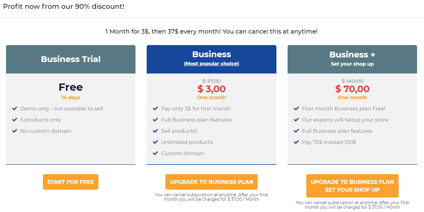 Hurry up to take advantage of our cool offer and get the Business plan for only $3, or Business + setting up your store for $70.