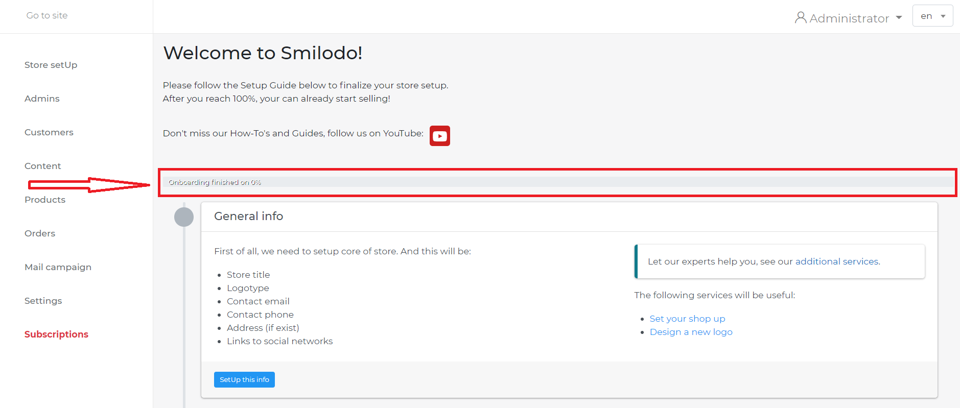 Click on the "Create store" button in order to create an online store on the Smilodo platform.